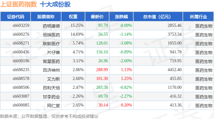 上证医药(000037)指数十大成份股详情如下: