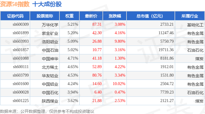 证券之星消息,1月28日,资源50(000092)指数报收于5947.35点,涨4.8%,成交1932.36亿元,换手率1.66%。当日该指数成份股中,上涨的有46家,中国铝业以10.02%的涨幅领涨,下跌的有4家,东阳光以4.91%的跌幅领跌。