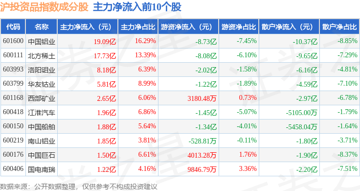 资金流向方面,沪投资品(000102)指数成份股当日主力资金净流入合计7.64亿元,游资资金净流入合计10.98亿元,散户资金净流出合计18.62亿元。成份股资金流向详情见下表:
