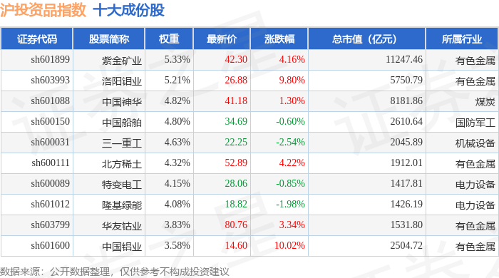 沪投资品(000102)指数十大成份股详情如下: