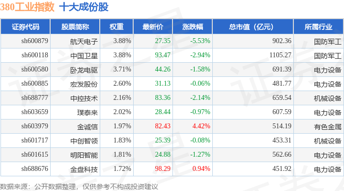 380工业(000106)指数十大成份股详情如下: