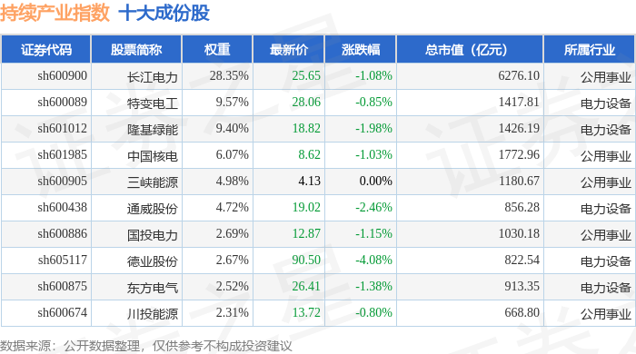 证券之星消息,1月28日,持续产业(000114)指数报收于1311.75点,跌1.37%,成交509.65亿元,换手率1.67%。当日该指数成份股中,上涨的有8家,怡球资源以9.97%的涨幅领涨,下跌的有30家,聚和材料以5.49%的跌幅领跌。