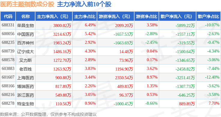 资金流向方面,医药主题(000121)指数成份股当日主力资金净流出合计17.46亿元,游资资金净流入合计7.71亿元,散户资金净流入合计9.75亿元。成份股资金流向详情见下表: