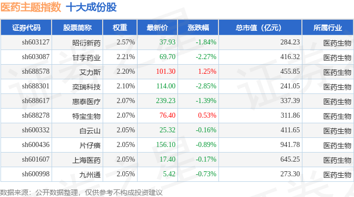 医药主题(000121)指数十大成份股详情如下: