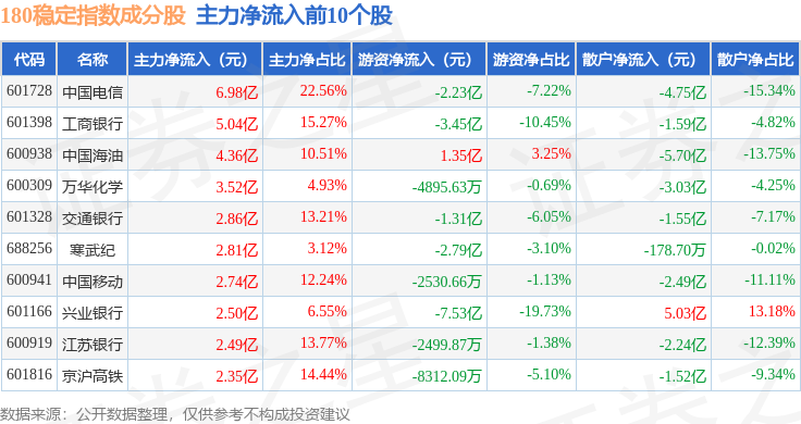 资金流向方面,180稳定(000125)指数成份股当日主力资金净流出合计2.22亿元,游资资金净流入合计30.92亿元,散户资金净流出合计28.7亿元。成份股资金流向详情见下表: