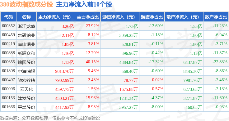资金流向方面,380波动(000130)指数成份股当日主力资金净流入合计10.8亿元,游资资金净流出合计2.72亿元,散户资金净流出合计8.08亿元。成份股资金流向详情见下表: