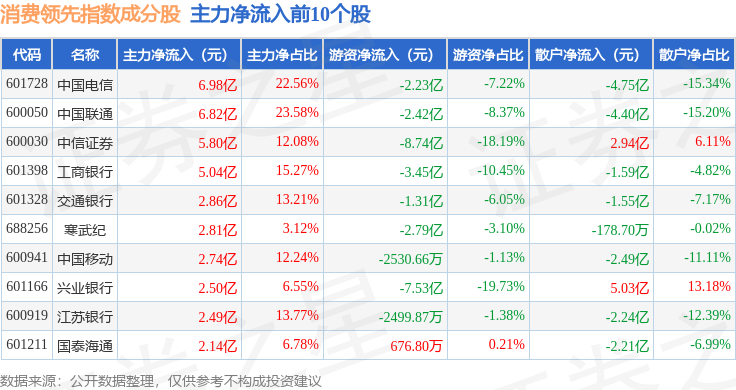 资金流向方面,消费领先(000148)指数成份股当日主力资金净流出合计7.23亿元,游资资金净流出合计1.1亿元,散户资金净流入合计8.33亿元。成份股资金流向详情见下表: