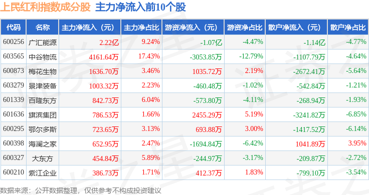 资金流向方面,上民红利(000153)指数成份股当日主力资金净流入合计1.86亿元,游资资金净流出合计1.05亿元,散户资金净流出合计8128.64万元。成份股资金流向详情见下表: