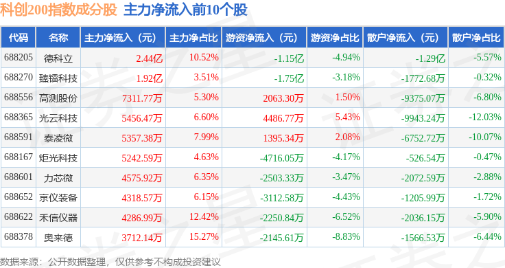 资金流向方面,科创200(000699)指数成份股当日主力资金净流出合计19.8亿元,游资资金净流入合计13.32亿元,散户资金净流入合计6.48亿元。成份股资金流向详情见下表:
