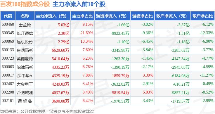 资金流向方面,百发100(000851)指数成份股当日主力资金净流出合计13.78亿元,游资资金净流出合计2.9亿元,散户资金净流入合计16.68亿元。成份股资金流向详情见下表: