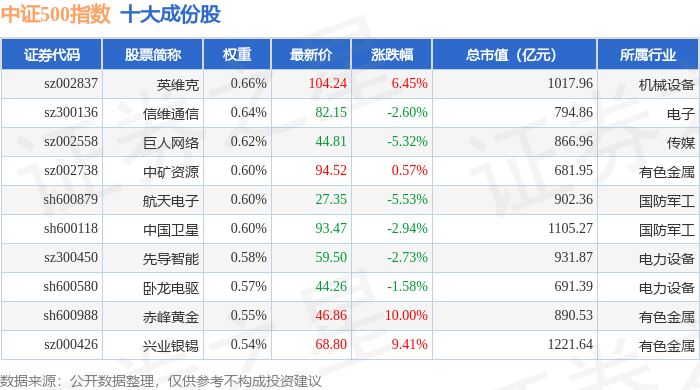 中证500(000905)指数十大成份股详情如下: