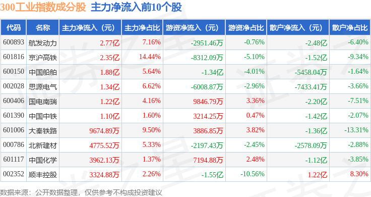 资金流向方面,300工业(000910)指数成份股当日主力资金净流出合计82.07亿元,游资资金净流入合计41.98亿元,散户资金净流入合计40.1亿元。成份股资金流向详情见下表: