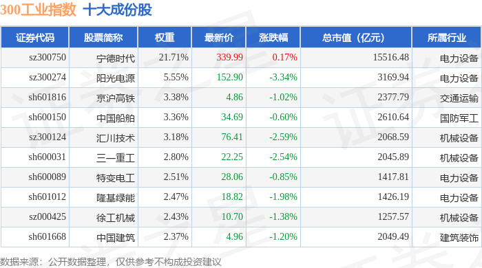 300工业(000910)指数十大成份股详情如下: