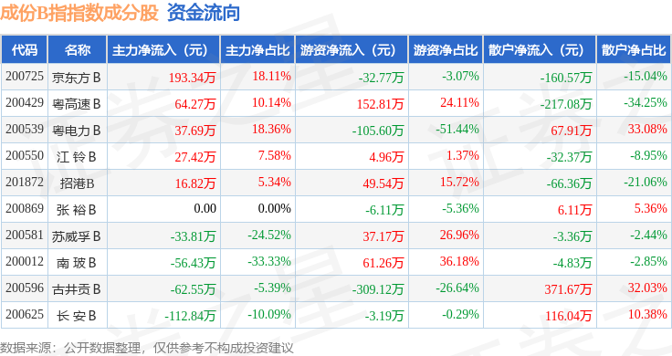 资金流向方面,成份B指(399003)指数成份股当日主力资金净流入合计73.91万元,游资资金净流出合计151.06万元,散户资金净流入合计77.15万元。成份股资金流向详情见下表:
