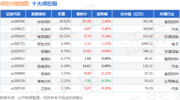 成份B指(399003)指数十大成份股详情如下: