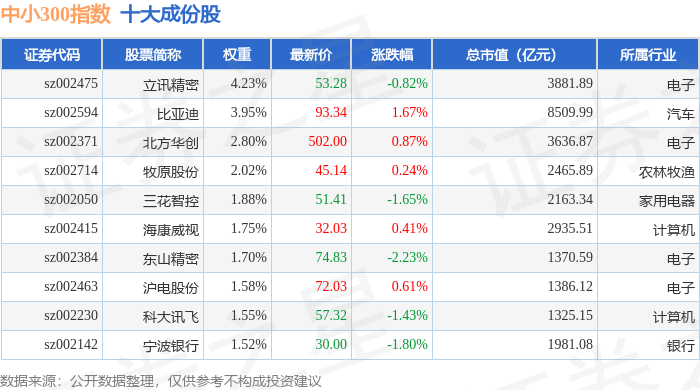 中小300(399008)指数十大成份股详情如下: