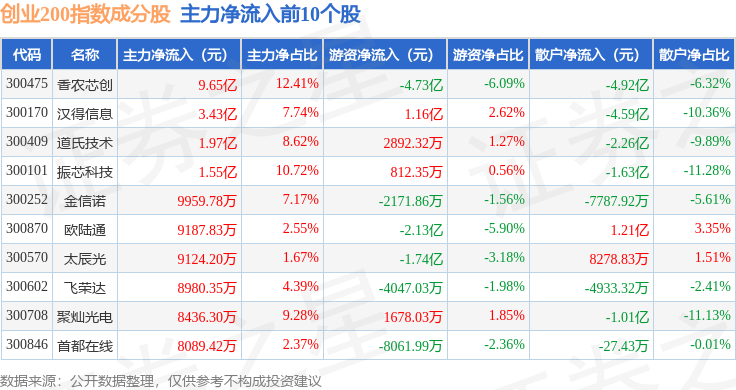 资金流向方面,创业200(399019)指数成份股当日主力资金净流出合计24.43亿元,游资资金净流入合计8.47亿元,散户资金净流入合计15.96亿元。成份股资金流向详情见下表: