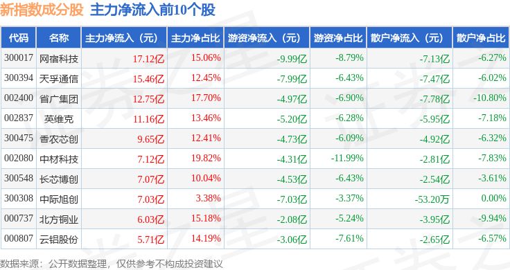 资金流向方面,新指数(399100)成份股当日主力资金净流出合计330.23亿元,游资资金净流出合计27.35亿元,散户资金净流入合计357.57亿元。成份股资金流向详情见下表: