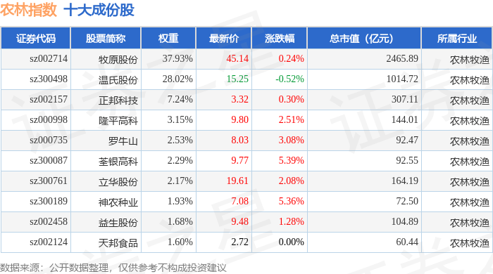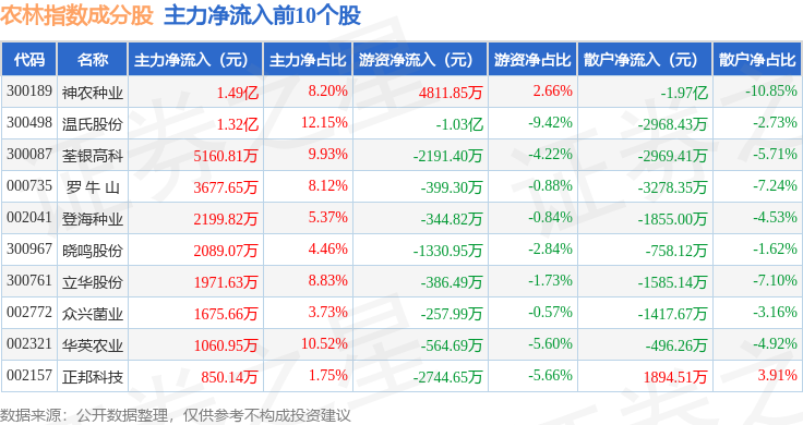 资金流向方面,农林指数(399231)成份股当日主力资金净流入合计2.77亿元,游资资金净流出合计2.35亿元,散户资金净流出合计4278.49万元。成份股资金流向详情见下表: