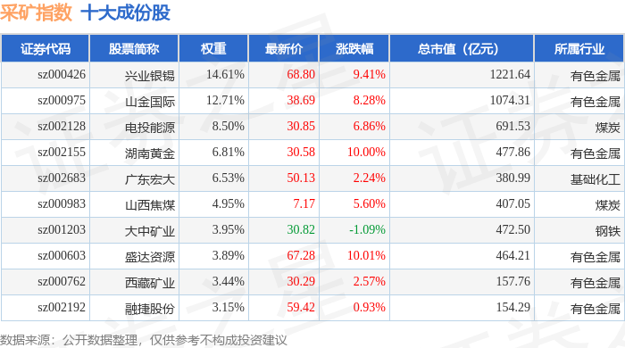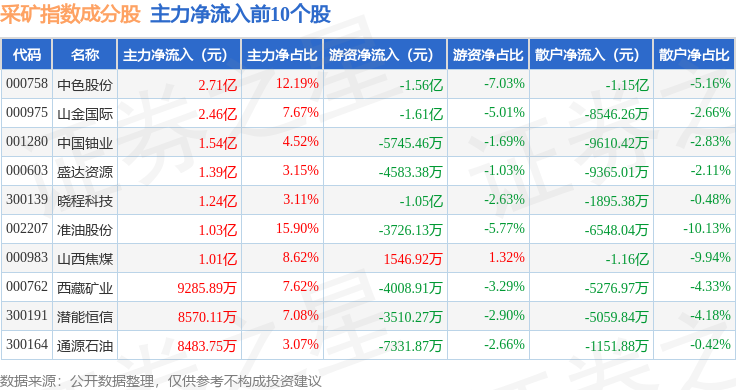 资金流向方面,采矿指数(399232)成份股当日主力资金净流入合计17.21亿元,游资资金净流出合计7.67亿元,散户资金净流出合计9.54亿元。成份股资金流向详情见下表: