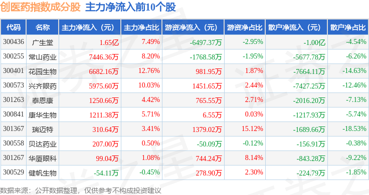 资金流向方面,创医药(399275)指数成份股当日主力资金净流出合计17.59亿元,游资资金净流入合计1.85亿元,散户资金净流入合计15.74亿元。成份股资金流向详情见下表: