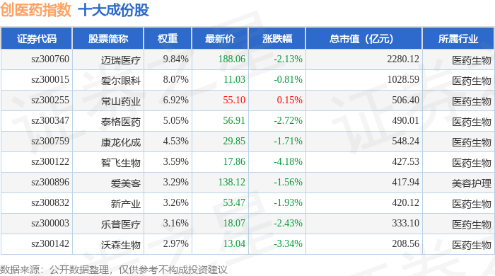 创医药(399275)指数十大成份股详情如下:
