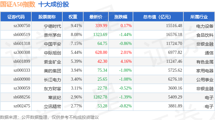 国证A50(399310)指数十大成份股详情如下: