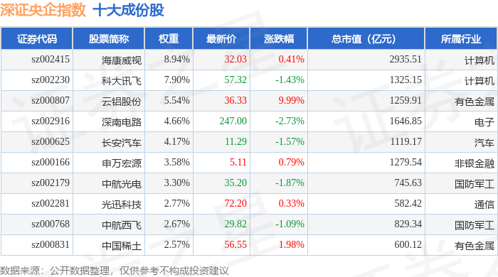 深证央企(399335)指数十大成份股详情如下: