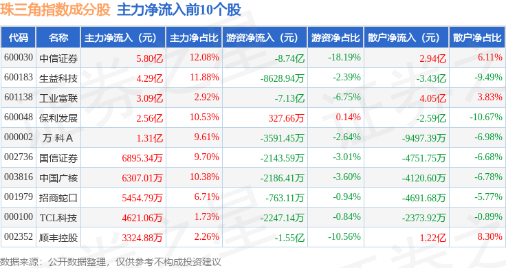 资金流向方面,珠三角(399356)指数成份股当日主力资金净流出合计36.69亿元,游资资金净流出合计24.42亿元,散户资金净流入合计61.12亿元。成份股资金流向详情见下表: