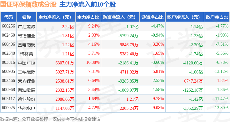 资金流向方面,国证环保(399358)指数成份股当日主力资金净流出合计67.92亿元,游资资金净流入合计12.92亿元,散户资金净流入合计55.0亿元。成份股资金流向详情见下表: