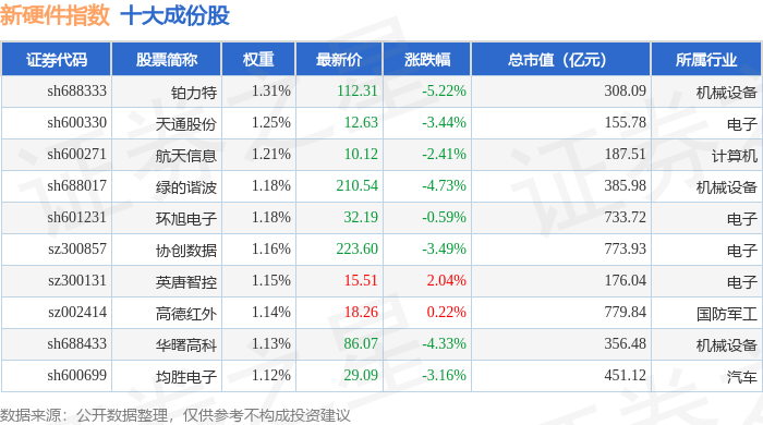 新硬件(399360)指数十大成份股详情如下: