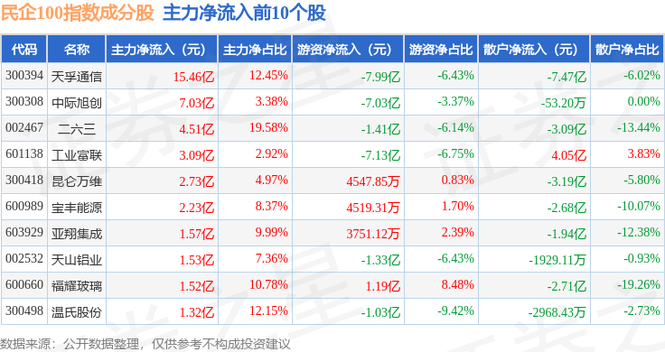 资金流向方面,民企100(399362)指数成份股当日主力资金净流出合计72.62亿元,游资资金净流出合计2.72亿元,散户资金净流入合计75.34亿元。成份股资金流向详情见下表: