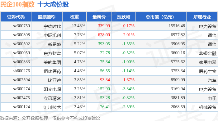 民企100(399362)指数十大成份股详情如下: