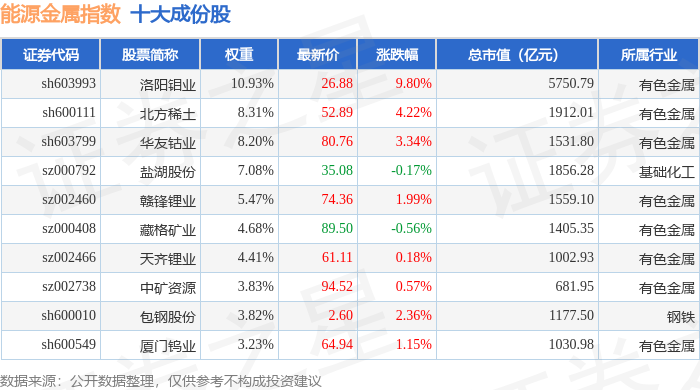 能源金属(399366)指数十大成份股详情如下: