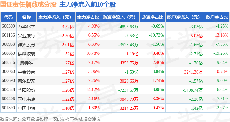 资金流向方面,国证责任(399369)指数成份股当日主力资金净流出合计35.88亿元,游资资金净流入合计20.2亿元,散户资金净流入合计15.25亿元。成份股资金流向详情见下表:
