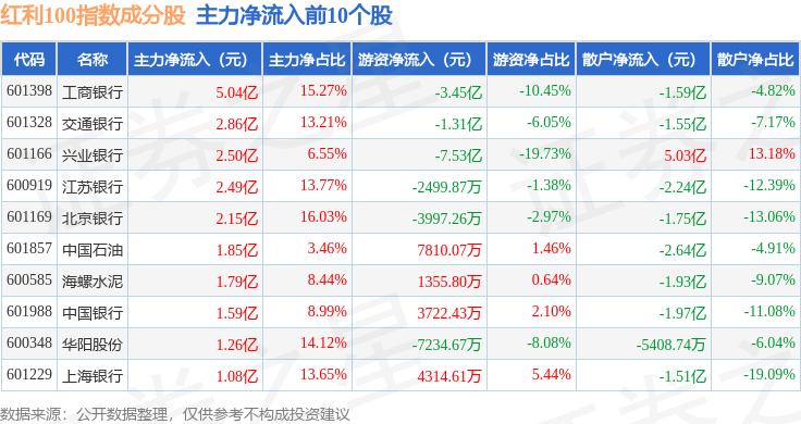 资金流向方面,红利100(399411)指数成份股当日主力资金净流入合计16.96亿元,游资资金净流出合计6.77亿元,散户资金净流出合计10.19亿元。成份股资金流向详情见下表: