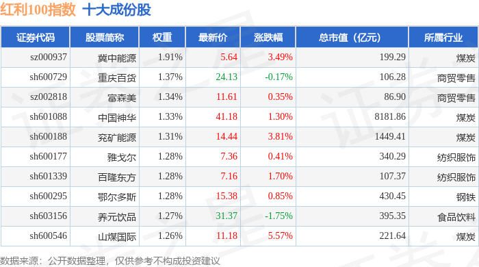 证券之星消息,1月28日,红利100(399411)指数报收于3574.22点,涨1.13%,成交841.95亿元,换手率0.52%。当日该指数成份股中,上涨的有69家,潞安环能以8.7%的涨幅领涨,下跌的有28家,思维列控以2.2%的跌幅领跌。
