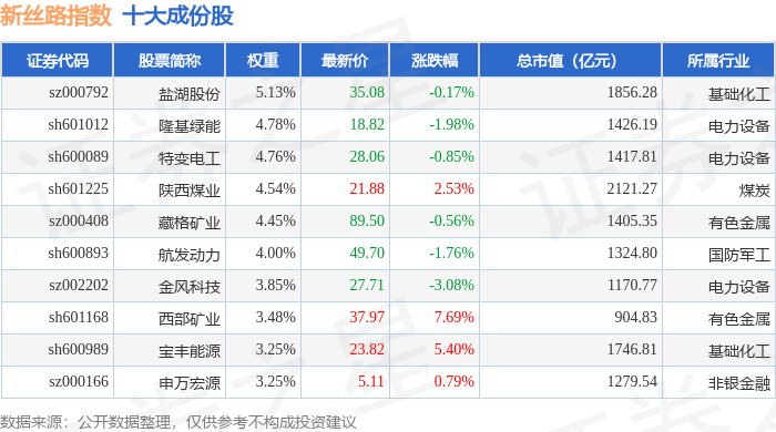 证券之星消息,1月28日,新丝路(399429)指数报收于2002.77点,涨1.07%,成交1181.45亿元,换手率3.0%。当日该指数成份股中,上涨的有55家,白银有色以10.04%的涨幅领涨,下跌的有44家,铂力特以5.22%的跌幅领跌。