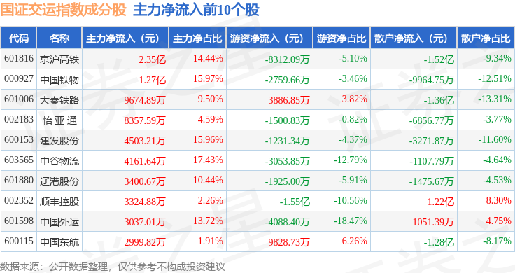 资金流向方面,国证交运(399433)指数成份股当日主力资金净流入合计1.11亿元,游资资金净流入合计3.94亿元,散户资金净流出合计5.05亿元。成份股资金流向详情见下表: