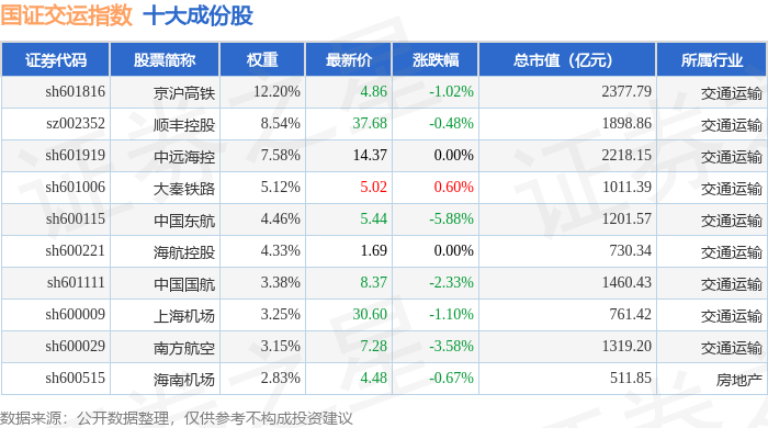 证券之星消息,1月28日,国证交运(399433)指数报收于1702.99点,跌0.44%,成交292.18亿元,换手率1.18%。当日该指数成份股中,上涨的有37家,怡亚通以5.27%的涨幅领涨,下跌的有19家,中国东航以5.88%的跌幅领跌。