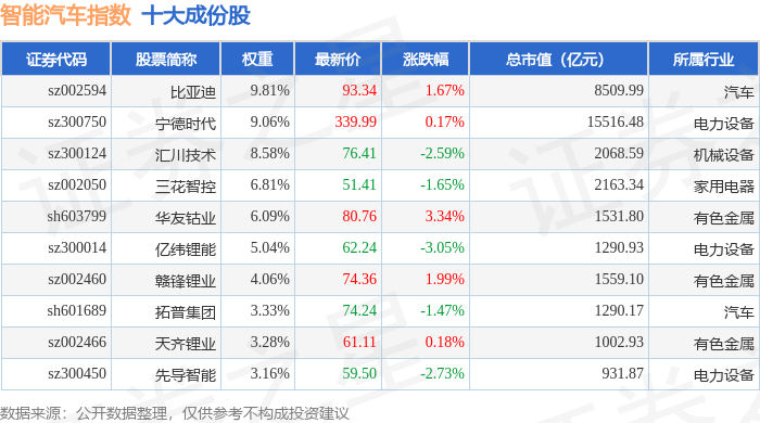 智能汽车(399432)指数十大成份股详情如下: