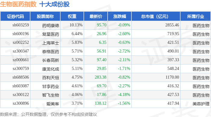 生物医药(399441)指数十大成份股详情如下: