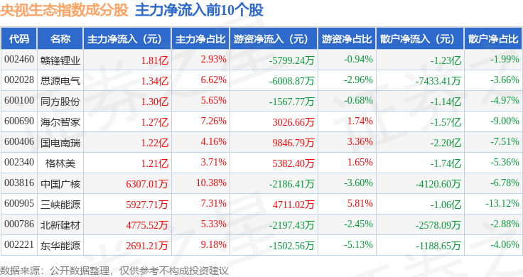 资金流向方面,央视生态(399556)指数成份股当日主力资金净流出合计69.18亿元,游资资金净流入合计4.7亿元,散户资金净流入合计64.49亿元。成份股资金流向详情见下表: