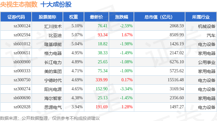 央视生态(399556)指数十大成份股详情如下: