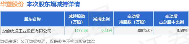 证券之星消息,1月28日华塑股份发布公告《华塑股份:安徽华塑股份有限公司股东集中竞价减持股份结果公告》,其股东安徽皖投工业投资有限公司于2026年1月21日至2026年1月27日间合计减持1477.58万股,占公司目前总股本的0.411%,变动期间该股股价上涨0.37%,截止1月27日收盘报2.71元。