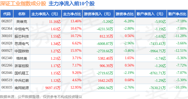 资金流向方面,深证工业(399615)指数成份股当日主力资金净流出合计98.94亿元,游资资金净流入合计11.4亿元,散户资金净流入合计87.54亿元。成份股资金流向详情见下表: