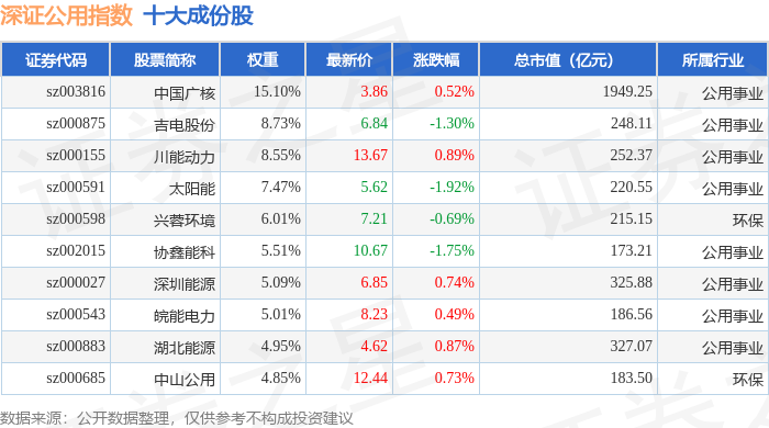 证券之星消息,1月28日,深证公用(399622)指数报收于1836.21点,涨0.23%,成交55.34亿元,换手率0.88%。当日该指数成份股中,上涨的有16家,建投能源以3.42%的涨幅领涨,下跌的有4家,太阳能以1.92%的跌幅领跌。