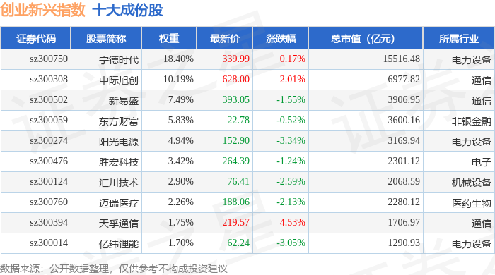 创业新兴(399643)指数十大成份股详情如下: