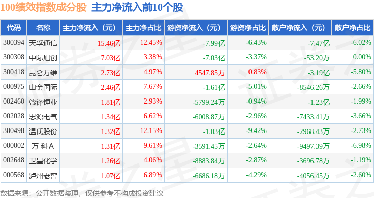 资金流向方面,100绩效(399656)指数成份股当日主力资金净流出合计85.06亿元,游资资金净流出合计21.22亿元,散户资金净流入合计106.28亿元。成份股资金流向详情见下表: