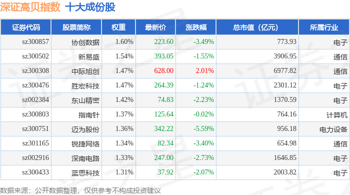 深证高贝(399662)指数十大成份股详情如下: